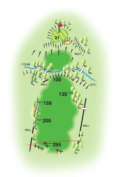 “This hole vies with the 10th as the most memorable. The downhill shot from an elevated tee tempts. After the humps of the buried field walls the fairway does widen out, but then there’s a ‘risk and reward’ situation. Go for the big shot across the Bentley Brook ravine to the small green cut high into the hillside, or lay up – you choose!”