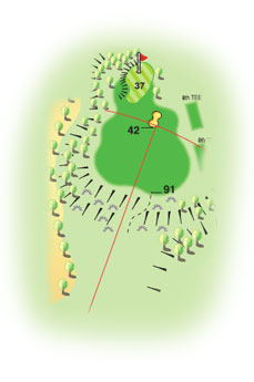 “If confidence on the tee is justified, this short Par 4 offers the chance of a birdie or even an eagle. If not, left lies a steep slope into the woods. To the right waits a bunker – most of which is hidden from the tee. Even if you avoid it, an approach from the right means clearing a line of hawthorns and playing across a long, narrow green.”