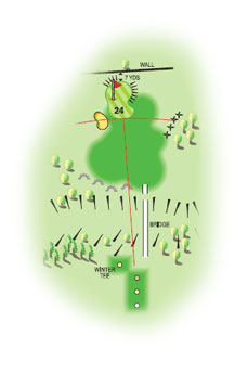 “The last of our Par 3’s involves a shot across a long ravine. The elevated green is one of the most difficult on the course to catch and to hold. Even if you do, its length and contours together with the pin position will influence whether two putts will be sufficient.”