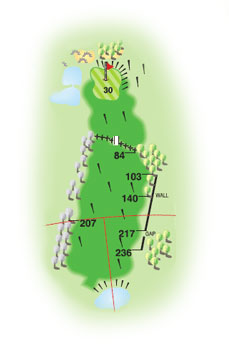 “The elevated tee shot across a valley to a tree-lined fairway is challenge enough, but it’s then uphill all the way. Other than in high summer, only long hitters have a chance of being on in regulation. Check the flag colour to determine which of the green’s two tiers houses the pin and watch out for the centenary ponds hidden to its left.”