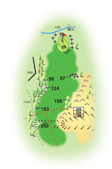 “A tough hole that has been the ruin of many a promising scorecard. A tee shot that avoids the heavy rough in the gully front and right sets up a long approach. There’s no sand; it’s not needed. The green features a strong left to right slope that has seen many a three-putt, especially from above the hole.”